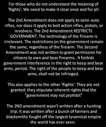 The legal consensus is that the Second Amendment applies to individual rights, within reasonable regulations. More on that below. |